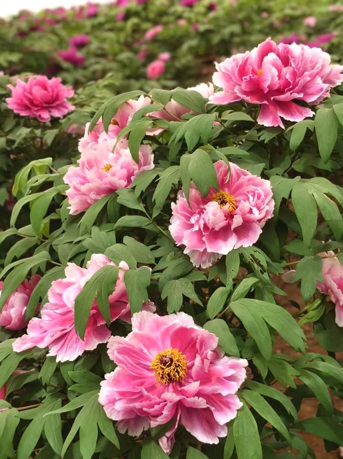 在这你能赏遍牡丹界的主要色系,常见花型。红色系的太阳、粉色系的赵粉、蓝色系的镰田锦、黄色系的海皇、黑色系的初乌、白色系的连鹤等。如花形优美、花瓣一丝一缕的银丝贯顶;初开像包菜、盛开时变身白衣仙子的春柳;粉中带紫、有似烛芯紫色斑点的宝莲灯;以及深紫花瓣点缀一缕缕白边的墨冠玉翅等,都是牡丹中佳品,较为少见。