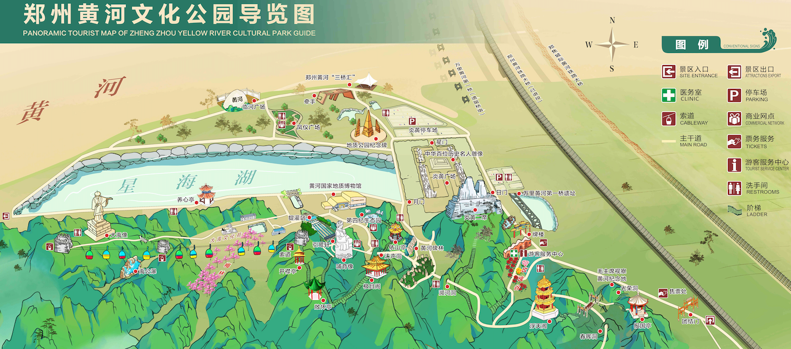 观光1: 景区入口、炎黄广场、黄河国家地质博物馆、哺育塑像、大禹山(索道往返)、黄河碑林、炎黄广场月门、黄河三桥汇 、 临河广场、凤仪广场、返回。