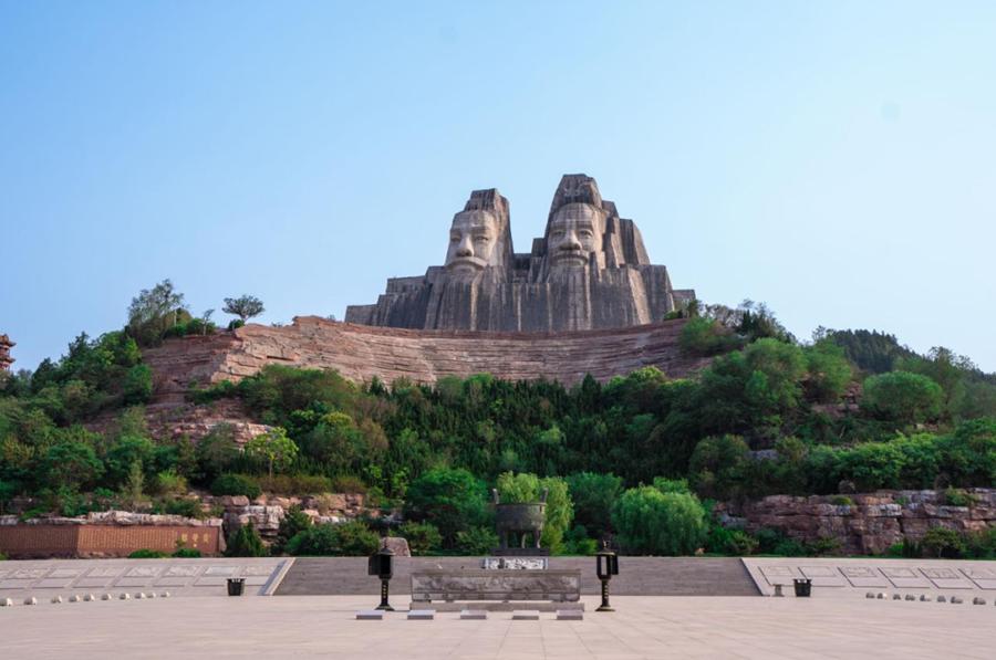 高度约106米,其中山高55米,像高51米,为世界知名大型雕塑之一,采用传统雕塑与建筑艺术结合手法建造。所使用的材料均是太行山真石,其中毛石7万多方,景石3万多吨。巨塑内部为双子座楼东侧10层,西侧11层,实用面积约8000平方米。眼长3米、鼻长8米,炎黄二帝两张巨大的脸合在一起就有1000多平方米。山体右下方是范曾教授为炎黄二帝塑像亲笔手书长达485字、长33米、宽3.3 米《炎黄赋》碑刻。塑像面朝黄河,融黄河、黄土、炎黄文化于一体,象征中华民族与大地共生、与山川同在的精神。基座由56个民族围合,配备钟、鼓及青铜鼎,仪式感强烈。