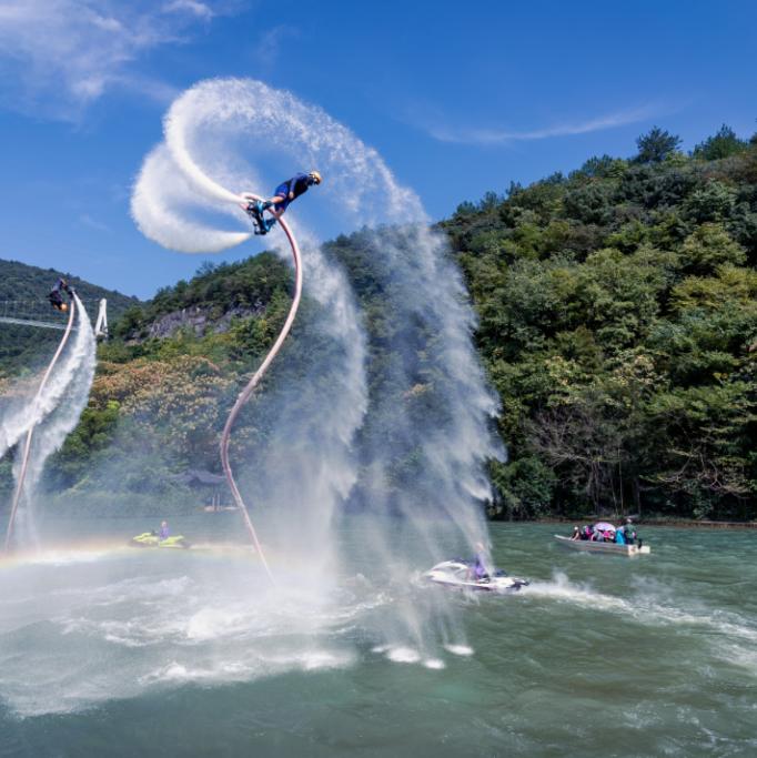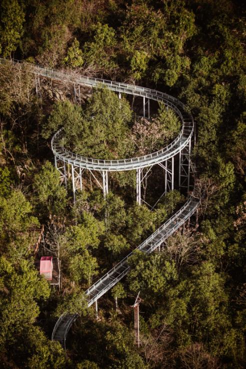 玻璃栈道漂流蜿蜒约1350米,坐上皮艇漂流下山,720°双环叠加旋转,急速滑行,全程刺激,水花四溅。
