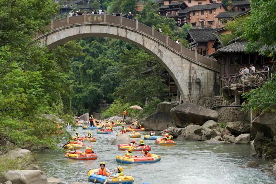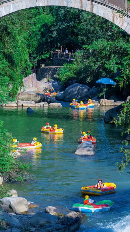 8公里,落差约185米,从漂流码头登上皮筏顺流而下,随着激流勇进在浪花中起伏不定,每一次转弯都充满了未知与惊喜。