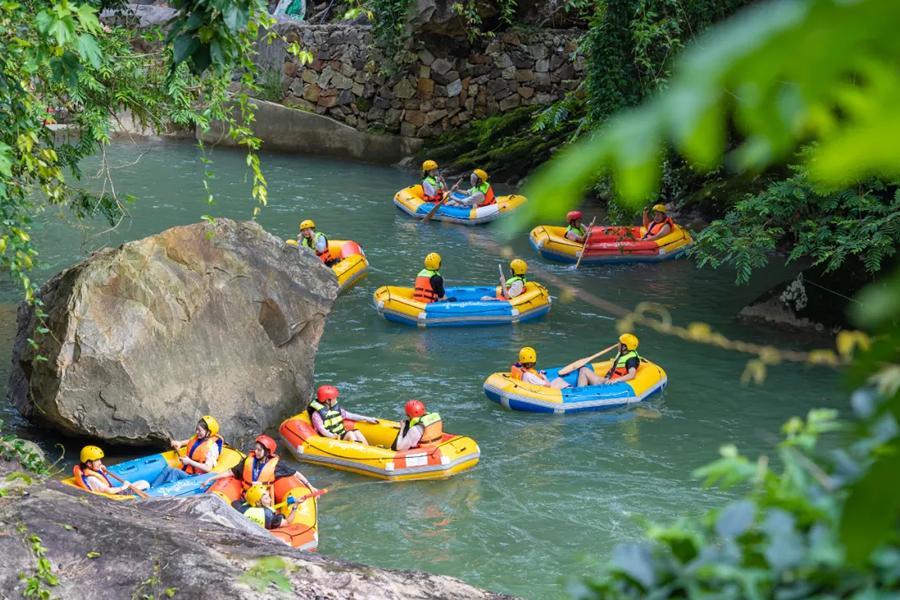 望仙谷漂流天然的河道,两岸翠绿的山林,蜿蜒的漂流河道仿佛一条绸带,穿梭于山谷之间。全长约2