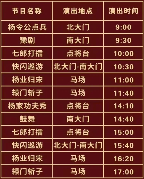 演出节目如:杨令公点兵、辕门斩子、杨业归宋、七郎打擂、豫剧 穆桂英挂帅、杨家功夫秀、鼓舞等节目每日定时上演。