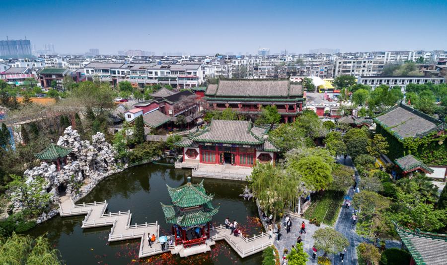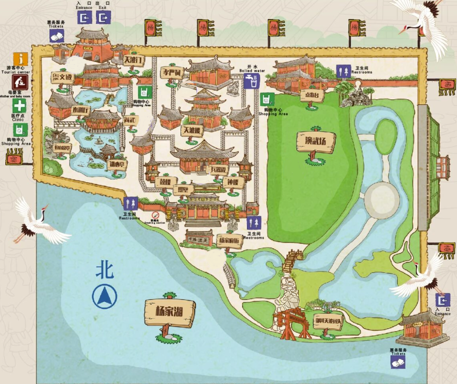 天波碧潭:面积2388平方米,潭水引自杨家西湖,蜿蜒穿过水榭、长廊、假山,形成动态水系。