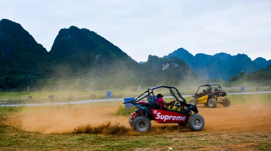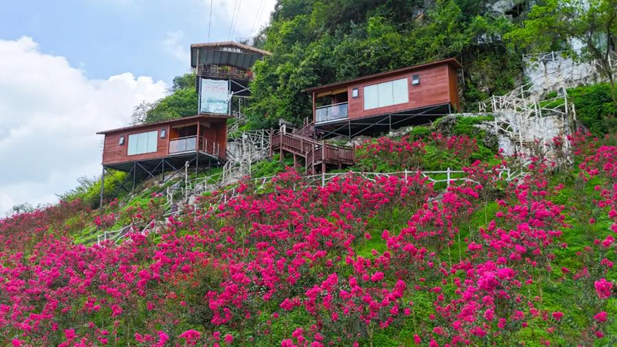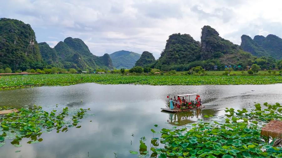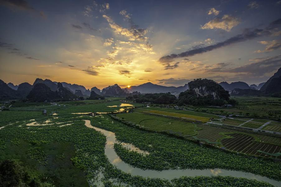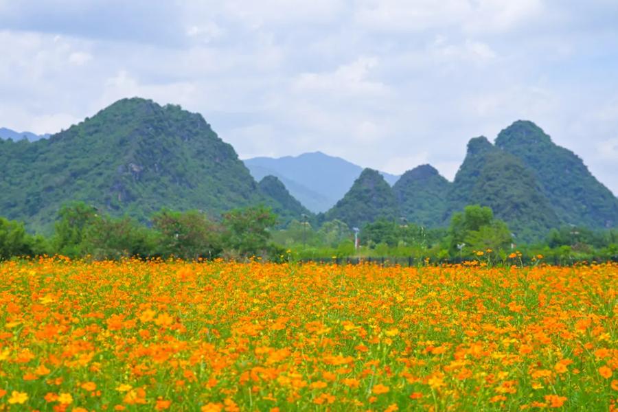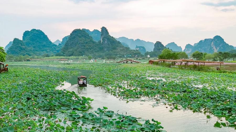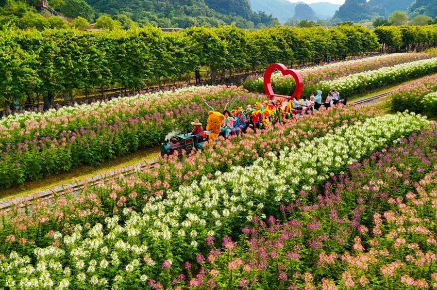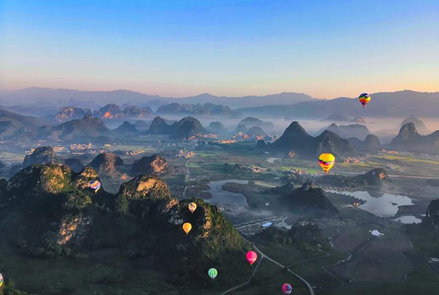 峰林晓镇不仅是欣赏千亩花海,油菜花、樱花、荷花等,夏季荷花铺展成一片碧波荡漾的绿色海洋。还有丰富的游玩项目,乘坐约3公里的小火车穿梭于碧波般的花海,穿越平地湖泊;热气球升空或动力滑翔伞翱翔,俯瞰峰林美景。