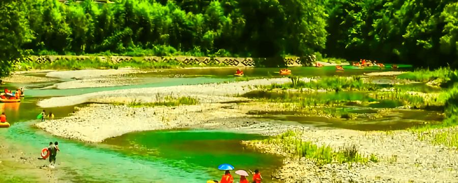 龙潭河风景区漂流,素有“十里画廊”的美誉,两岸绿树苍翠,漂流的弯道此起彼伏,漂流河道长度约为10公里左右,途经大大小小的滩潭,水质清澈纯净,漂流河道有较大的落差,起点与终点之间海拔相差约百米。