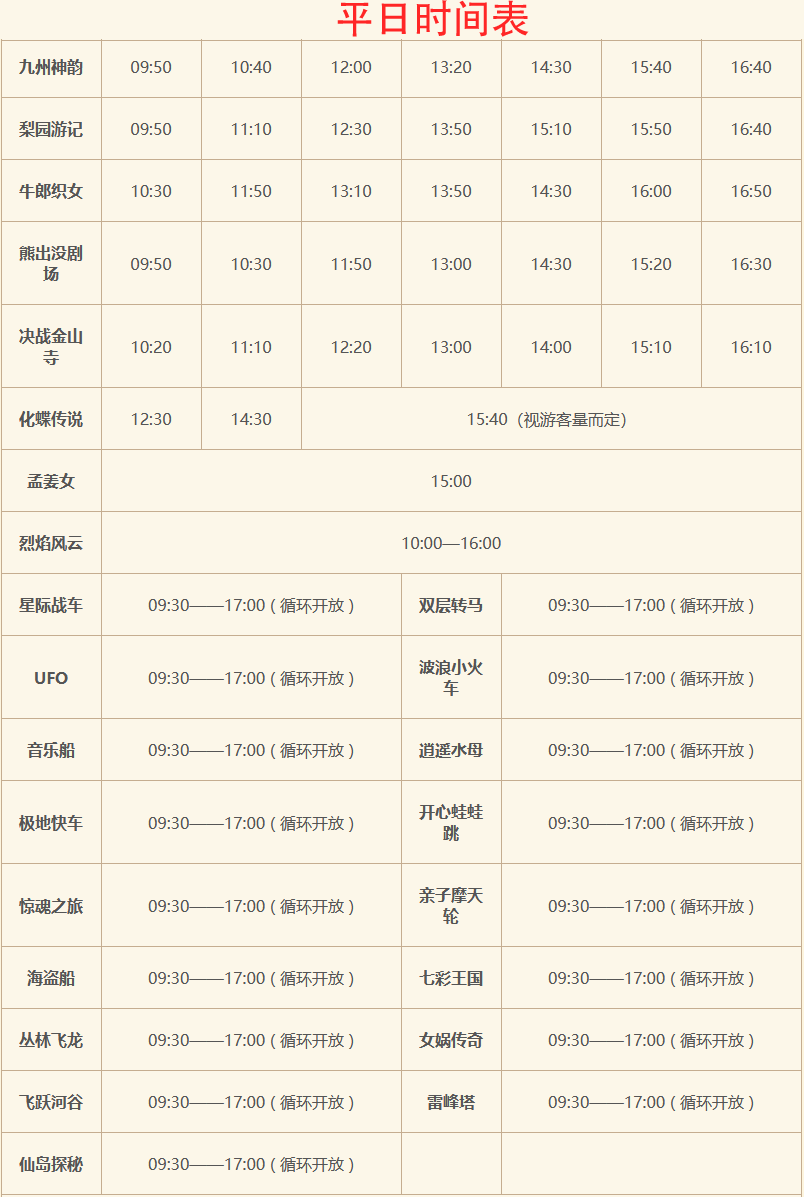平日时间表,以上信息如有变更,以当日园区公告为准。