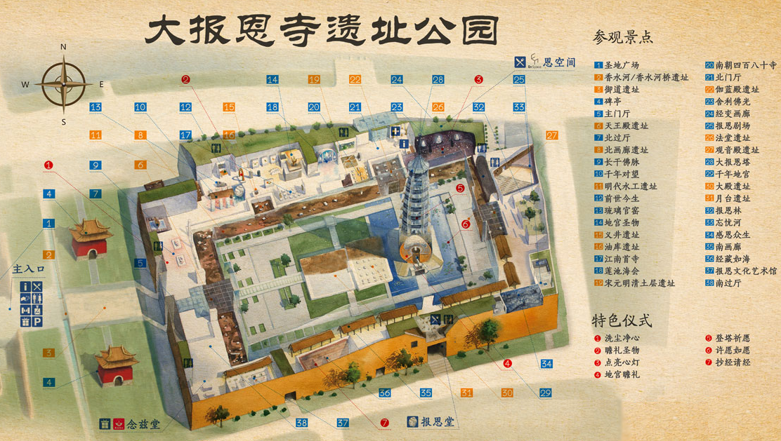 游客中心、主门厅、长干佛脉、千年对望、前世今生、地官圣物、江南首诗、莲池海会、南朝四百八十寺、舍利佛光、经变画廊、千年地宫、大报恩塔、报恩林、忘忧河、感恩众生、南画廊、经藏如海、报恩文化艺术馆、出口。