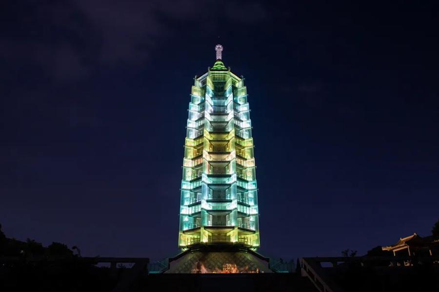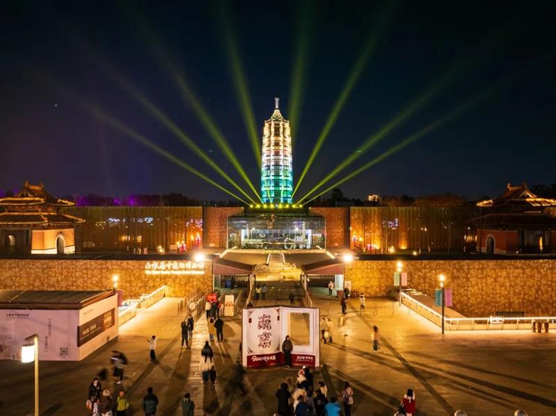 2015年建成遗址公园对外开放,新建的大报恩塔,以现代工艺成就新塔古韵,琉光塔影,重建为轻质钢架玻璃塔,高约93.157米,夜间通过LED灯光再现琉光塔影,晚上19:00有点灯仪式。复原40米画廊遗址,结合现代光影技术呈现《九色鹿》等佛教故事壁画。