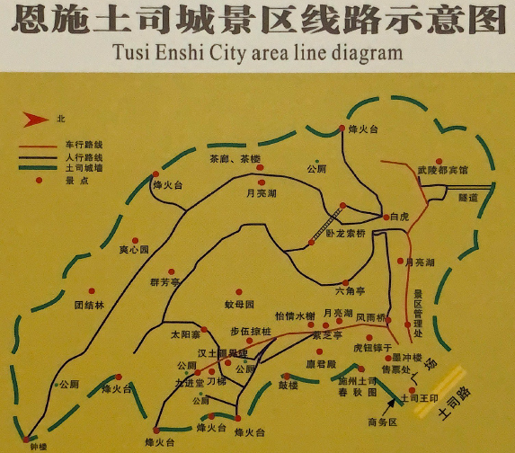 南门入口:南门、钟楼、城墙、九进堂、汉土疆界碑、土司校场、廪君殿、怡情水榭、风雨桥、月亮湖、虎纽錞于、墨冲楼