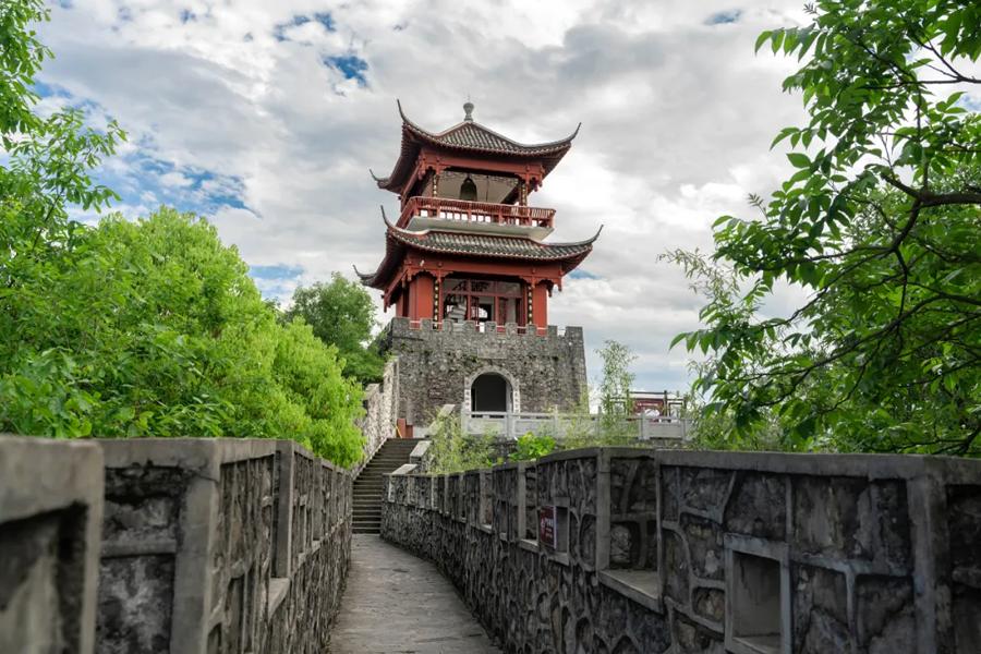 恩施土司城景区城墙的最高处是钟楼,一座三层的亭塔式建筑,底层为城墙,中层为城楼,顶层为亭。亭内悬一口重约3000斤的大铜钟,钟上铸有999字铭文,记述了土家族的历史。