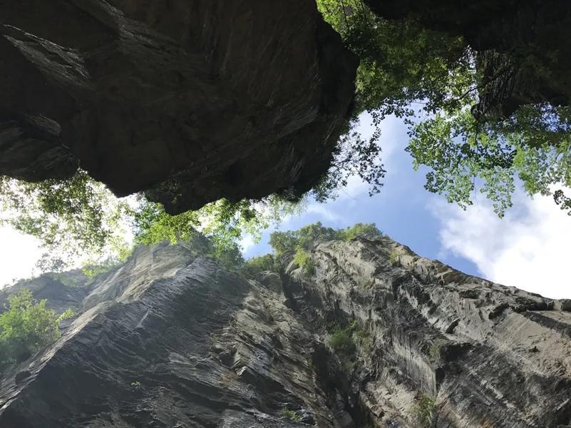 峡谷全长约800米,两侧峭壁高耸达百余米,最窄处仅容一人通过,岩壁上可见清晰的水流侵蚀纹路与古生物化石痕迹。