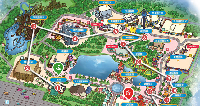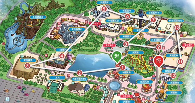 浪漫之旅;1方特城堡、2聊斋、3魔法城堡、4唐古拉雪山、5生命之光、6飞越极限、7华夏五千年、8高空飞翔、9双层转马、10熊出没历险记、11疯狂成语、12波浪翻滚、13海盗船、14空中飞舞