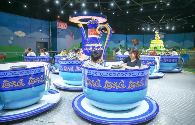 室内亲子体验项目区,包含旋转小蜜蜂、单层转马、果虫滑车、转转杯、儿童爬山车、淘气堡等。