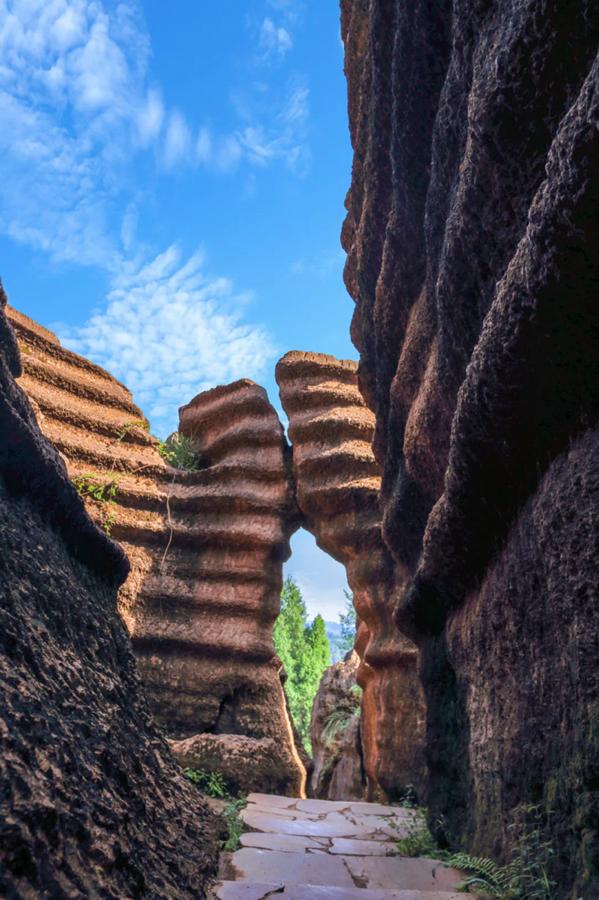 红石林国家地质公园,与芙蓉镇隔酉水河相望和猛洞河漂流景区相邻。岩石含铁锰氧化物,晴天时紫红如霞,雨后褐红似墨,晨昏光线差异下色彩层次丰富,宛如一幅动态山水画。石峰、石墙、石林、溶洞、天坑等,分布在群山峻岭之中,喀斯特地貌形态俱全,被誉为“红石林博物馆”。