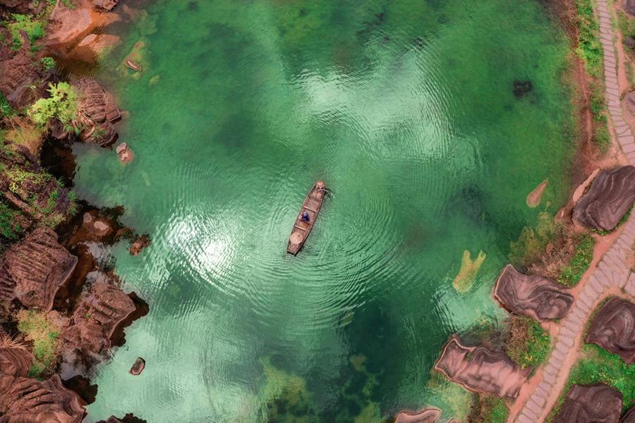 天然奇观,在景区的中轴线上,分布着天、地、人三池。喀斯特地貌形成的天然湖泊,水色清澈,与红石林相映成趣。