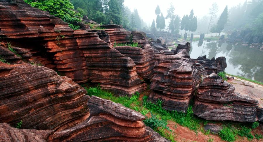 晨雾中的扬子古海,披着神秘的外纱,踽踽而来,因矿物质的不同,红色和灰色层层相间,如同少女的裙摆,多彩缤纷。尤为称奇的是,它晴天一片紫色,雨后顿成褐色,须臾之间,变化多端,令人惊叹!