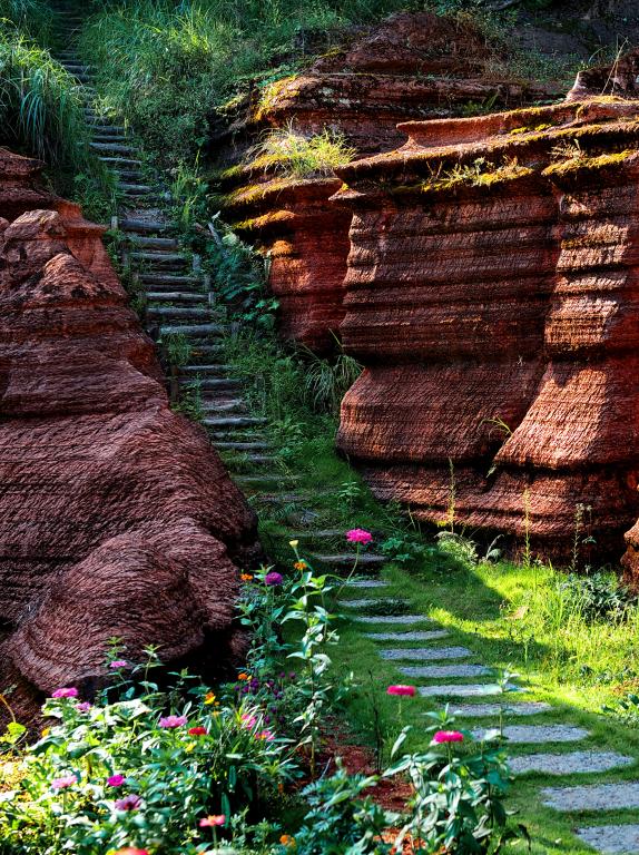 从奥陶海底往里走就是花儿包啦,也就是冰石夫妻所在的地方。冰石夫妻在这里相拥相守,共同经历了数不清的岁月。春夏的红石林,处处花海,洋溢着草原和花儿的芬芳,在花儿包,玫瑰不是格外动人的颜色,百合不是极具迷人的芬芳,薰衣草不是令人沉醉的风景,唯有格桑花,送给你爱情最美好的祝福。
