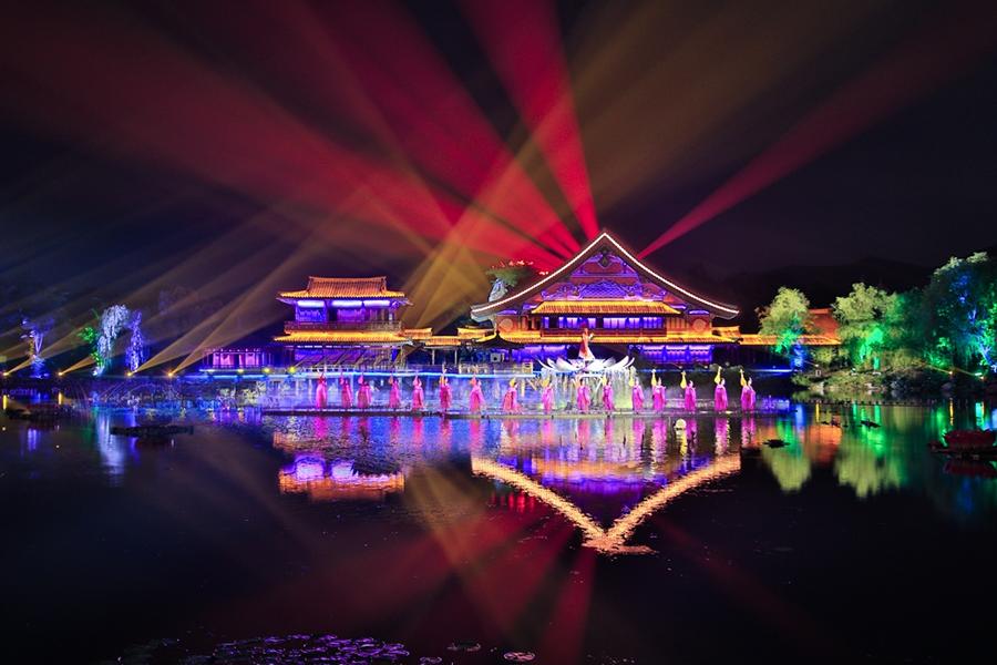 夜间灯光秀《大唐倚梦》重现霓裳羽衣舞。