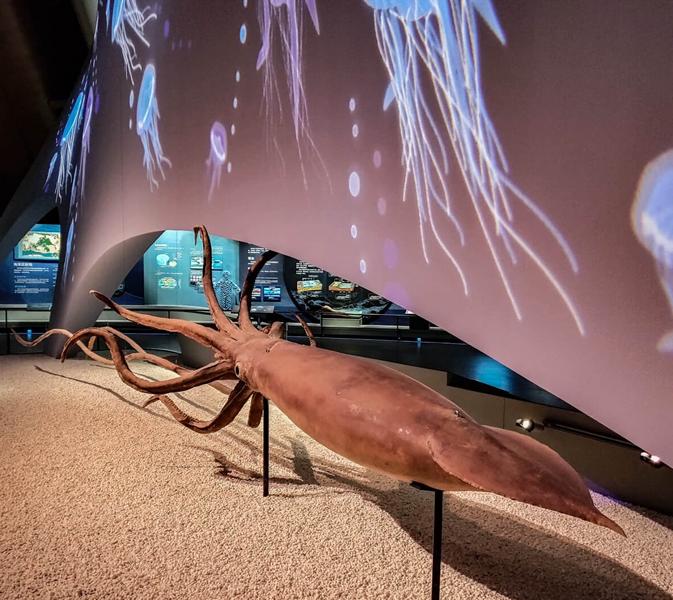 远古海洋,常设展览,博物馆一层:展示的是新生海洋——新生代海洋部分,新生代海洋是6600万年前至今这段时间的海洋。新生代时期,海洋地理环境、生物种类都呈现出了全新的面貌。喜马拉雅山脉逐渐隆起,南北两极形成了极冷的气候,海洋地理环境也形成了我们如今比较熟悉的七大洲四大洋的格局。新生代海洋中海生爬行动物较多减少,取而代之的是我们更熟知的腹足类、哺乳类、鱼类、双壳类等。