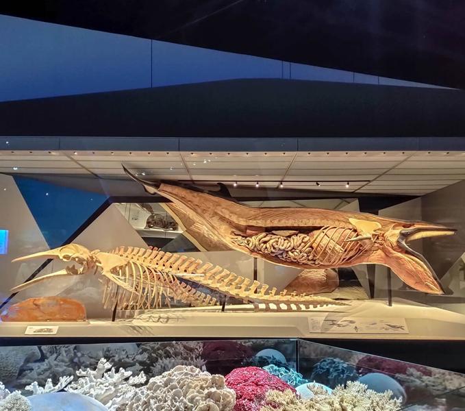 远古海洋,常设展览,博物馆一层:展柜中展出是鲸的演化。鲸类是现代海洋里最为壮观哺乳动物。早期重要的古鲸类以巴基鲸、陆行鲸等为代表。其中巴基鲸是一种半水生的栖息在海岸一带的食肉类动物,它有完善的四肢,可以在岸上缓慢行走,但大部分时间呆在水里,依靠四肢在水中划行走动。巴基鲸是科学家们目前广泛认同的鲸类祖先,也是当时少数首先探索海洋生活的哺乳动物之一。巴基鲸体型较小,只有狗那么大,而仅仅用了1200万年,就演化出了体长可达20米的龙王鲸。龙王鲸头小,身体细长,看起来像海蛇,它的后肢已经处于半退化的状态,与现代哺乳动物不同的是,龙王鲸既不能长时间的潜水,也无法在陆地上移动,它只能采取在海洋表面水平移动的运动方式。经历漫长的演化过程后,古鲸类终于在渐新世走向灭绝,鲸类的现代支系起源于晚始新世并迅速演化出了多样的种类。