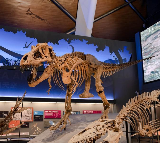 有15个展厅如远古海洋、龙的时代等,还有体长10米的霸王龙骨架复原模型;高19.8米长27米的宋代福船复制品模型;长达9.4米的鲸鲨标本,以及较为罕见的怀孕双髻鲨塑化标本;长约8.3米的大王乌贼塑化标本。