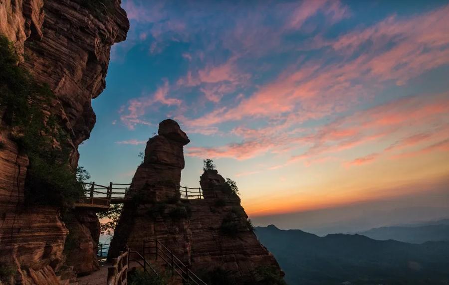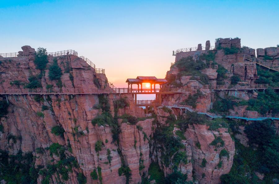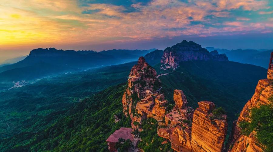 东太行一道天脊,两川胜景;云端漫步,俯看人间。置身天堑栈道,移步换景,气象万千,宛如一幅太行山水长卷。修建在海拔千米上的绝壁栈道,堪称太行山人工奇观。漫步栈道,行云缭绕,犹如踏云仙境。画境北高峰,登高望远,感受会当凌绝顶、一览众山小的奇特体验。
