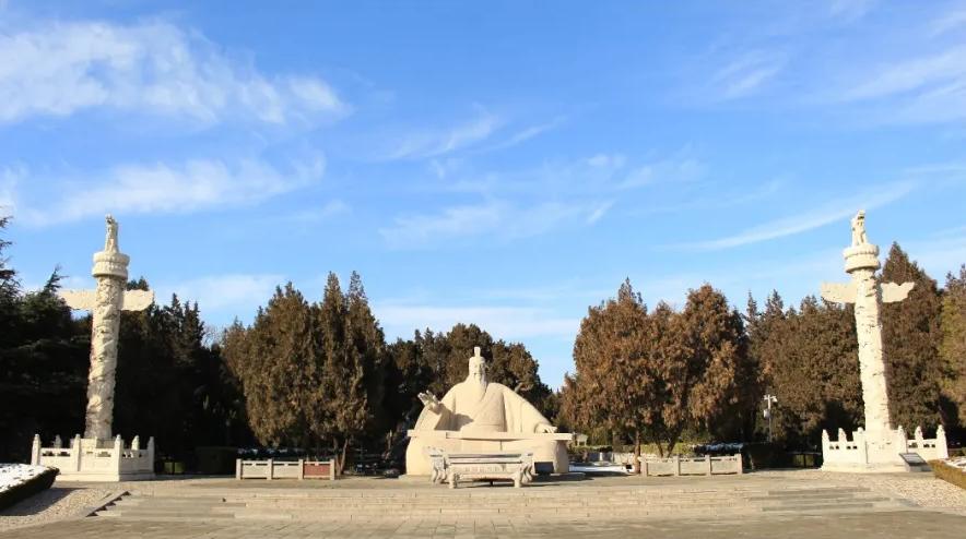 陵冢 帝陵为砖砌方形墓冢,高约3米,周长约51米。正面立着“有虞帝舜陵”石碑,陵前嵌有“有虞氏陵”石碣一方。舜帝是有虞氏,所以也被称为虞舜。舜帝陵庙中轴线上布列戏台、献殿、正殿,两厢为配殿、钟鼓楼,主从有序,结构严谨。正殿塑有舜帝像,华服正冠,双手持笏交叠于胸前,双眼平和目视着众生,似是慈悲地望着这片华夏大地上的岁月流淌、生生不息。陵冢上的古柏约两千多年,树顶由五大枝干组成。
