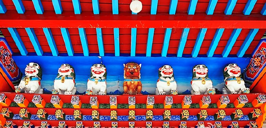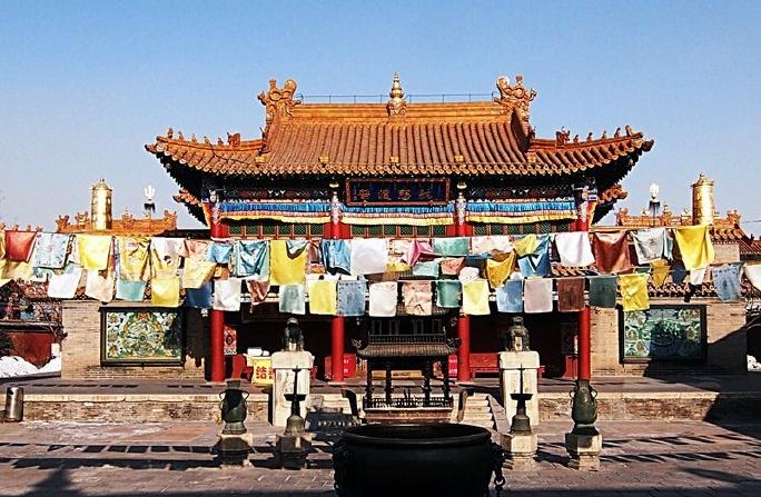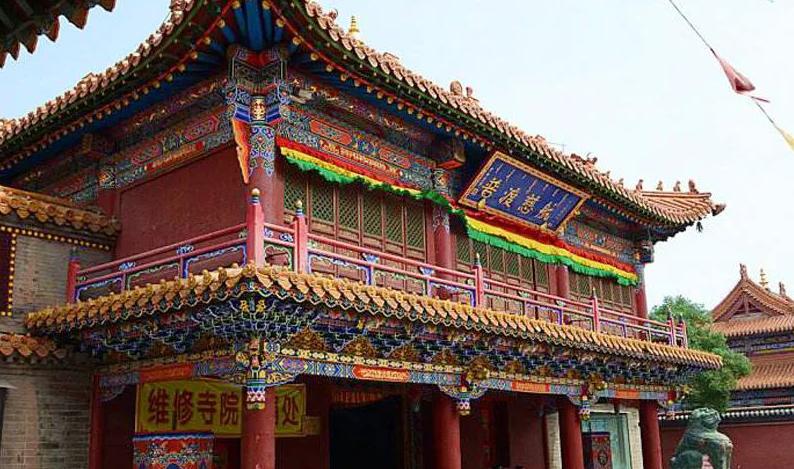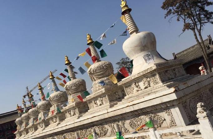 55米,距今约400年历史;在银佛座前,有两条造型生动的金色龙雕,高约10米;大雄宝殿融合藏汉建筑风格,殿内木雕、砖雕、壁画工艺精湛。释迦八塔莲聚塔、四缔塔、菩提塔等。