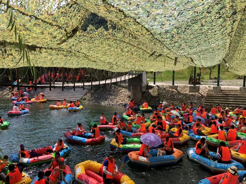 约3.4公里山泉水漂流,漂流河道九曲十八弯,大小落差约120多处,最大落差近300米,沿途穿越竹林秘境水质清澈无污染,激流险滩与平缓水域连环相连,两岸怪石嶙峋,绿树成荫,风景秀丽,在刺激中领略绿林谷峡谷风光。全程游玩时长约1小时。