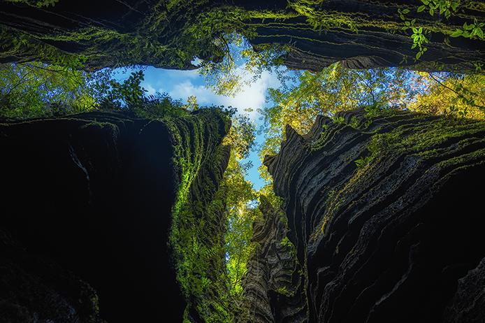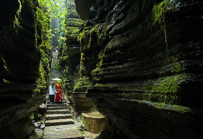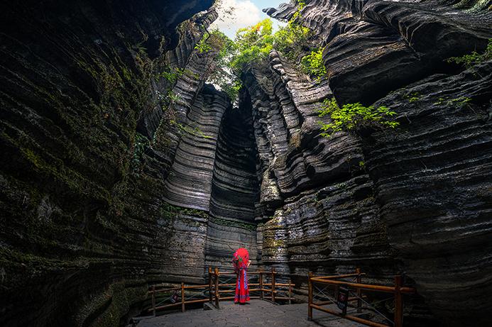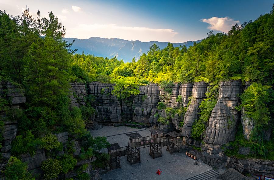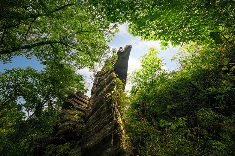 千古部落的莲花寨、溶洞秘境的磨子沟、天河悬瀑的九龙汇;山峰高峻陡峭,奇石千姿百态,犀牛沟的成片石林高约20米,犹如穿行海底迷宫般美轮美奂;青龙台可登观景台俯瞰石林核心景致;整个石林外形像一只巨大的葫芦。