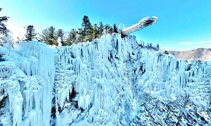 高空滑漂 是九峰山高空畅滑项目,是用钢化玻璃建成的凹槽水滑道,长约1100米,落差约75米,坐在橡皮船里,体验在树梢上飞行,在绿浪中穿越的惊奇感受。