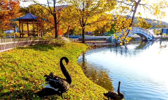 五福岛 五岛分别种植黑果腺肋花楸、李子、苹果、杏、樱桃等五种果类,成熟后供游客采摘,岛与岛之间有拱桥相连,象征着五福相连不断。