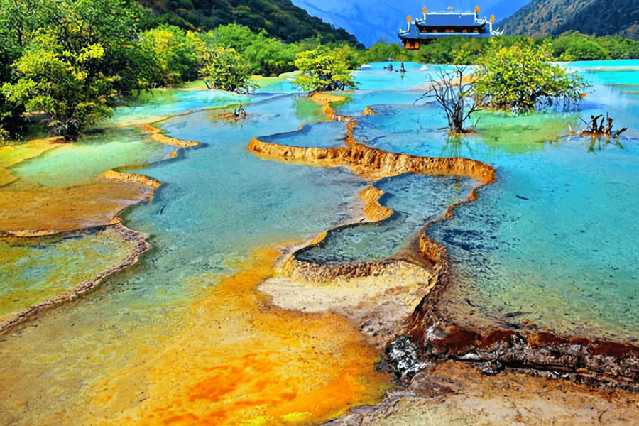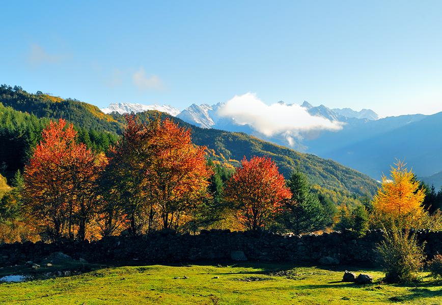 神木垒景区有高山草甸、原始森林、雪山湖泊、高山钙化池、红叶彩林等。五彩斑斓五彩池是许多形态各异的高山钙化流池,这些流池宛如镶嵌在山间的宝石。高山草甸,如同一片片绿色的地毯铺展在山间。秋是红杉林美丽的季节。
