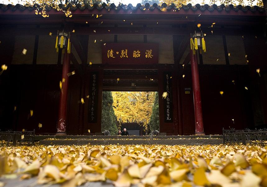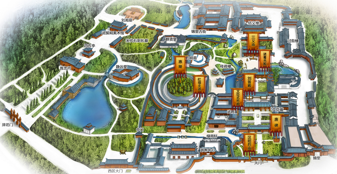 成都武侯祠,是纪念刘备、诸葛亮、关羽、张飞等蜀汉英雄的君臣合祀祠庙,也是具有广泛国际影响力的三国遗迹博物馆。占地面积约15万平方米。主要由惠陵、汉昭烈庙、武侯祠、三义庙等组成的三国历史遗迹区,主体建筑为武侯祠。武侯祠分大门、二门、刘备殿、过厅、诸葛亮殿、三义庙等,排列在从南到北的一条中轴线上。祠内供奉刘备、诸葛亮等蜀汉英雄塑像,区域内还有众多的关于诸葛亮和三国文化的碑刻、匾额等。