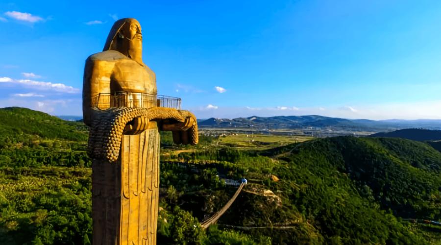 炎帝像 呈站立姿态,浑身金色,总重量约150吨,面部庄严肃穆,神态气宇轩昂。 在老顶山国家森林公园的山顶,矗立着一尊高约39米的炎帝铜像,其中,像高约25米,基座高约14米,宽约24米,长约29米。基座又分两大部分,第一部分为三层,每层高约2米,表面为白色花岗岩贴面,有台阶相通;第二部分为展厅,外高约8米,红色花岗岩贴面,正面镶着长约8米,高约5米的铜板敷设的牛头浮雕。铜像左侧有一巨型石碑,它长约6米,高约3米,镌刻着关于炎帝在此创立光辉业绩的碑文。 炎帝铜像中间是空的,沿旋梯可上至炎帝胸部谷穗处,这里是一个可容纳约20人站立的观景平台,站在如此高度,上党盆地远近景物,尽收眼底。 由基座后的台阶进入展厅,这里以图片、文字说明、实物等形式,展示了炎帝在此开创人类古代农业文明的伟大贡献。