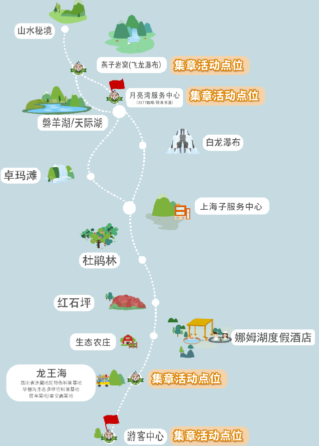 憩息在白龙瀑布的山谷丛林中,海拔约3586米,上可观雄峰峻岭,白龙瀑布的气势磅礴,下可赏花丛溪流,较佳的季节是在春末夏初,绿草茵茵,各种色彩艳丽的野花点缀其中,一片生机盎然。如若现在是6月中旬至8月中旬,这一片草地更是在蓝天白云的映衬下,显得较为靓丽多彩。