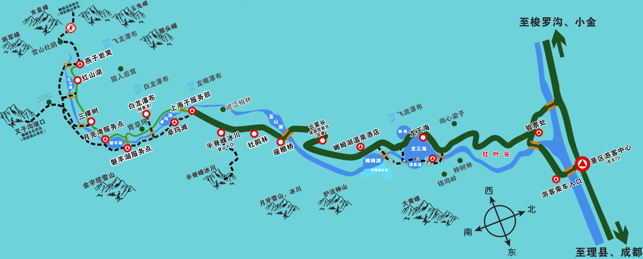 全程约11公里,海拔约2200至2900米之间,区内植被丰茂,覆盖着高大的乔木及亚高山暗针叶林,针阔混交林,这里有成片的箭竹、红桦、沙棘。还栖息着国家一、二类保护动物,川金丝猴、小熊猫等。峡谷间倾泻而下的流水形成了较高的迭瀑,十分壮观。秋季,林海尽为秋色所染,红、黄、绿层次井然,如火如霞的红色秋叶,像雪山的灵魂,尽情地展现着多情的姿态,适宜观赏期10月至11月。