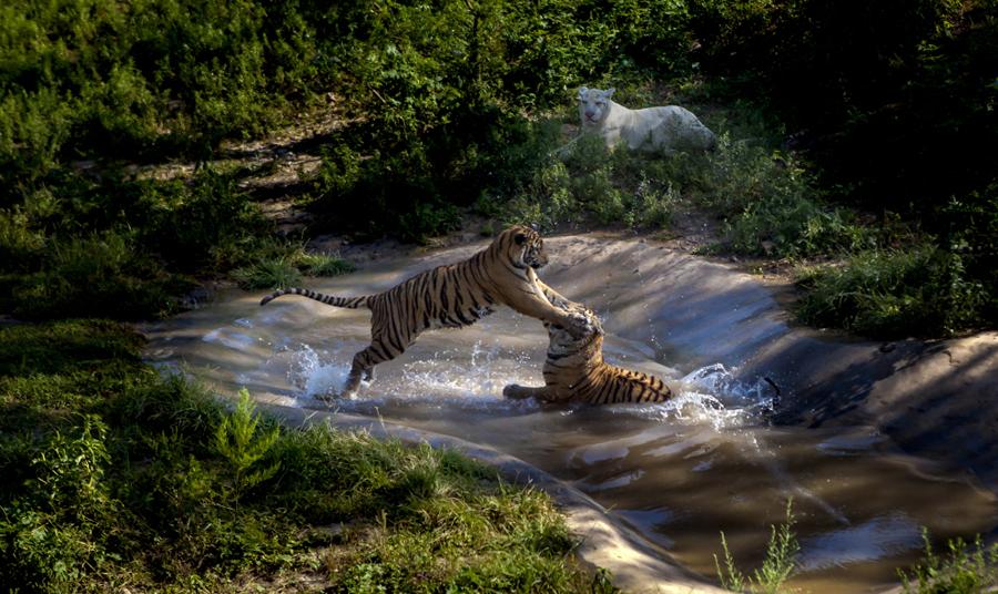 居住着园内特色动物金虎、白虎、雪虎、孟加拉虎、非洲狮、斑鬣狗、孔雀、秃鹫等动物。设有猛兽探险隧道,便于游客在安全的状态下,近距离观赏老虎,可以感受猛兽扑面而来的刺激和震撼。