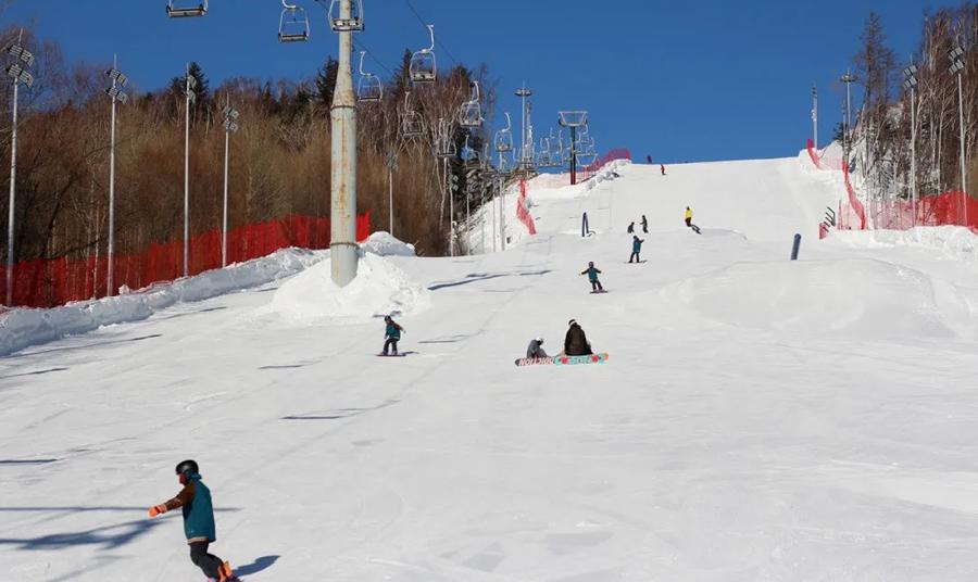 初、中级滑雪道长约500米和400米 越野雪道长约1000米 坡度陡峭,地形复杂的高级雪道 随着一阵欢呼声从雪道顶端传来,几位滑雪者如箭一般从山顶冲下,滑雪板在粉雪上划出优美的弧线,细腻的雪花在阳光下飞扬,仿佛舞动的白色精灵。