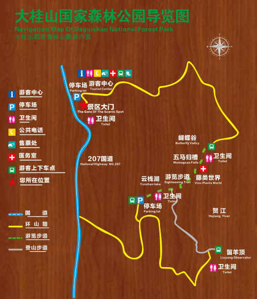 路线一(享受型):可从景区一号门乘坐观光车进入景区,沿途欣赏大桂山景区五马归槽瀑布、巨藤王国、云栈湖等景点,到达云栈湖停车场后乘坐观光车登顶。