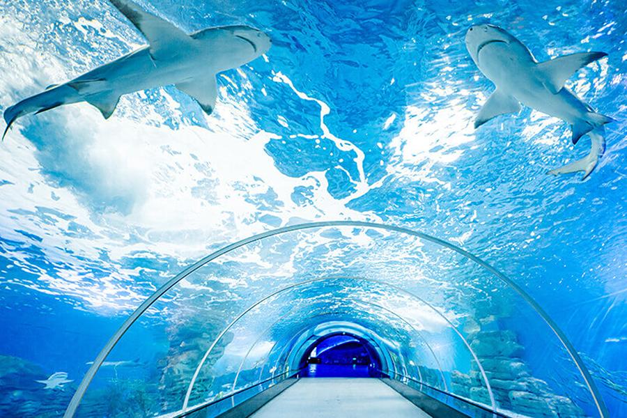 不仅能在沙滩上看到憨厚可爱的长寿海龟们,还能在触摸池里近距离地与海洋鱼类来一个亲密接触;置身于远古的海底沉船,成群的鲨鱼在身边游弋;漫步长约200米的海底隧道中,上万条色彩缤纷的鱼类围绕在身边,仿佛触手可及。近距离探索海洋生物的形态习性与生活特性;还可以认识海洋中真实的美人鱼原型海牛等。