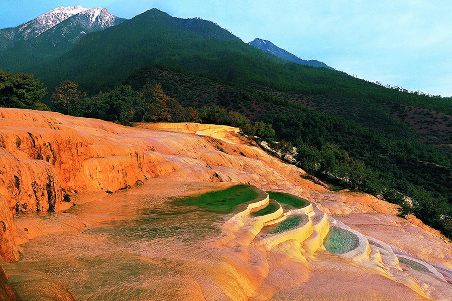 白水台景区,距市区约101公里,海拔约2380米。白水台被称为“仙人遗田”,纳西语为“巴卜芝”,意为逐渐长大的莲花,面积约3平方公里,是国内已知规模较大的冷泉型淡水碳酸盐泉华台地,泉水中的碳酸氢钙在阳光照射下分解为碳酸钙逐渐沉淀,长年累月形成台幔,宛似玉埂银丘。雪白梯田盛满含有碳酸氢钙的泉水,千百年来日日流淌在这片土地,感慨大自然的神奇秀美。