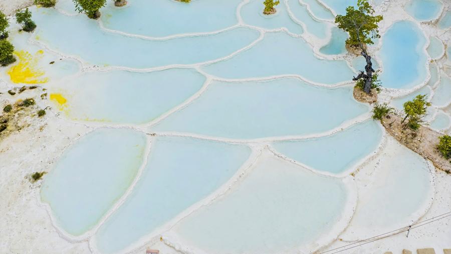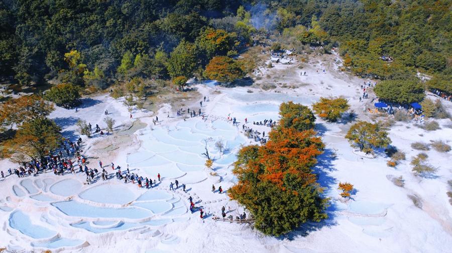 站在高处俯瞰,白水台像是一片从天际飘落的巨大白云,又似用整块汉白玉雕成的艺术品,镶嵌在青山之间,构成了一幅如诗如画的美景。沿着景区内的步道游览,欣赏层层叠叠的梯田状碳酸钙沉积物以及清澈见底的泉水。