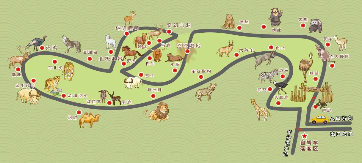 澳洲原野、熊踪秘境、沼泽湿地、亚洲丛林、奇幻山洞、林隐鹿鸣、北极地带、森林王者、草原霸主、狂野非洲等,有黑熊、鸸鹋、赤大袋鼠、棕熊、孟加拉虎、白狮、非洲狮、斑马、长颈鹿、河马、大象、犀牛等。乘坐观光小火车或自驾,穿越猛兽栖息地。小火车途中可投喂羊驼、骆驼等温顺动物。