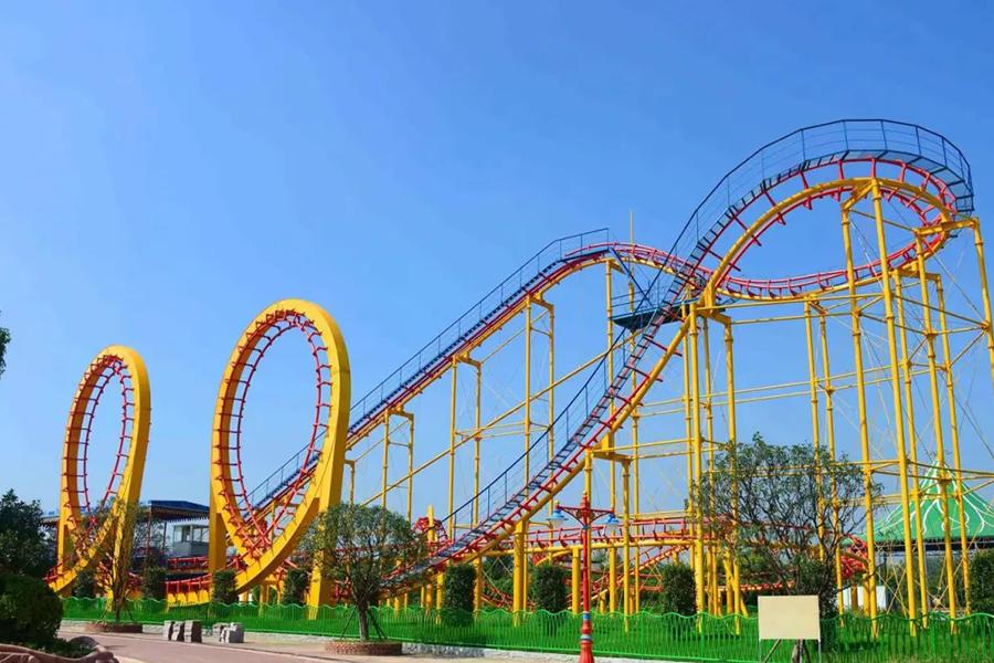 五环过山车惊险、刺激、迅猛俯冲,连续上下翻转颠倒!令观看者无不惊叹,给乘坐者刺激、失重、离心状态下的极致欢乐。轨道总长约500米,有高速俯冲下滑段、高空翻转的立环段、螺旋段、水平环段等。
