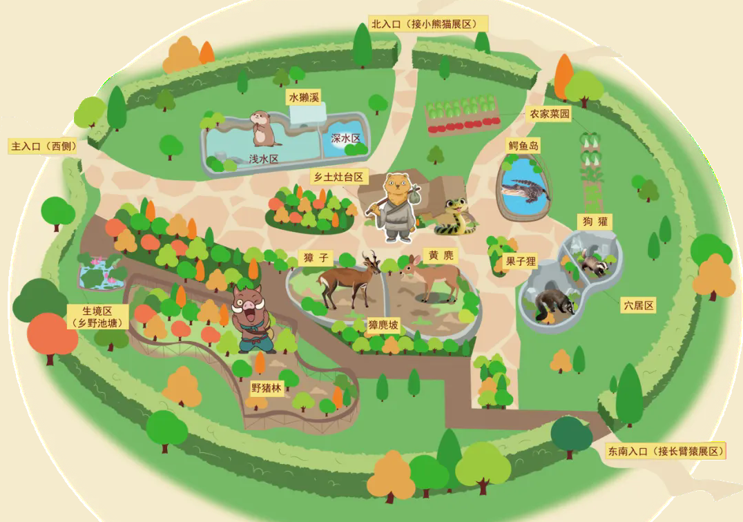 动物乐园:熊猫、小熊猫、狮子、老虎、熊、袋鼠、棕熊、非洲狮、东北虎、海狮、火烈鸟、黑颈天鹅、斑嘴鹈鹕、鸳鸯、花脸鸭、翘鼻麻鸭、赤麻鸭、绿头鸭、白天鹅、黑天鹅、灰雁、斑头雁、狼、金钱豹、松鼠、秃鹫、松鼠猴、环尾狐猴、黑叶猴、黑帽悬猴、赤猴、长臂猿、金丝猴、羊驼、黇鹿、汤氏瞪羚、梅花鹿、南非剑羚、黑尾牛羚、白长角羚、斑马、麋鹿、山羊、斑鬣狗、薮猫、野猪、土拨鼠、细尾獴、水獭、獐、卡皮巴拉等;