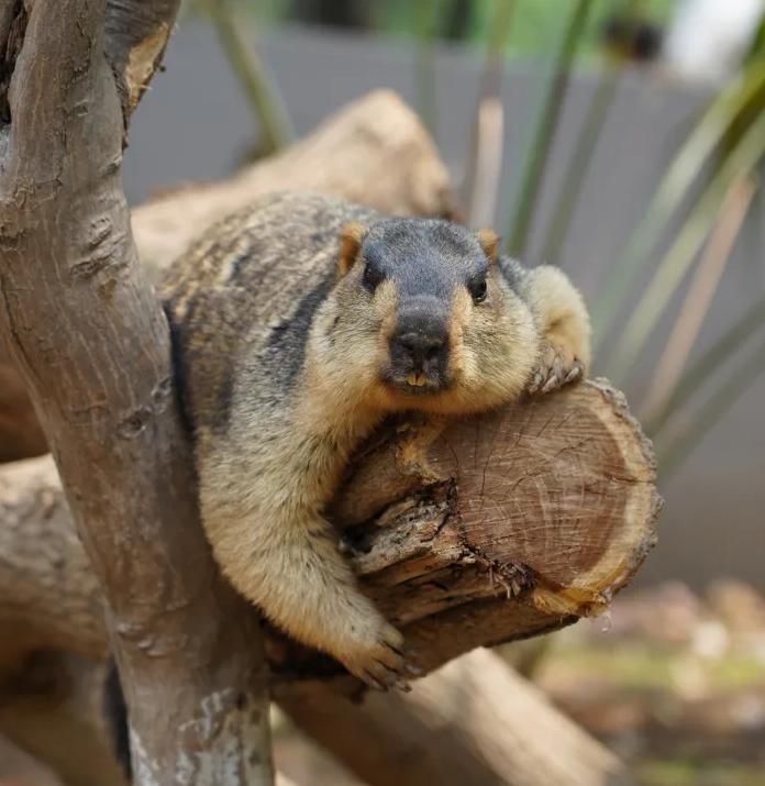 “月亮”公主自带“贵气”,因吃竹子时总爱用头部破开竹竿,被粉丝亲切封为“铁头帮副帮主”。它有着标志性的炸毛大耳朵,配上一圈黝黑饱满的眼圈,远远望去像只圆滚滚的胖小鸟,萌态十足。性格偏“高冷”的“月亮”胆子较小,喜欢安静的地方。园区里最常见的画面,便是它蜷在高高的树梢上酣睡:有时轻轻翻个身,把圆肚皮贴在树干上;有时干脆四脚朝天,将毛茸茸的身子摊开,尽情享受高处的微风与宁静,活脱脱一位“树梢睡美人”。