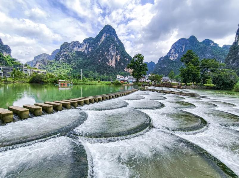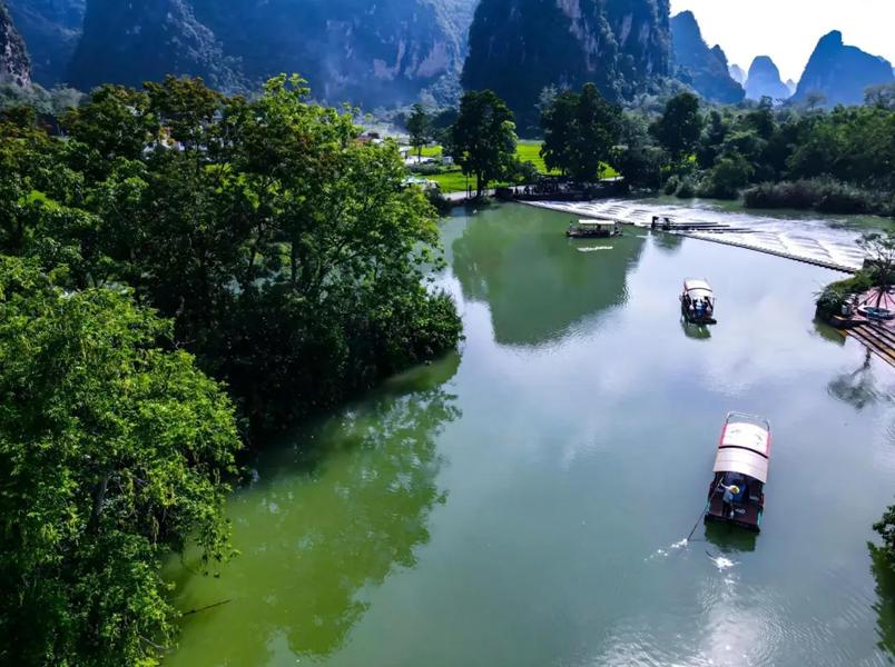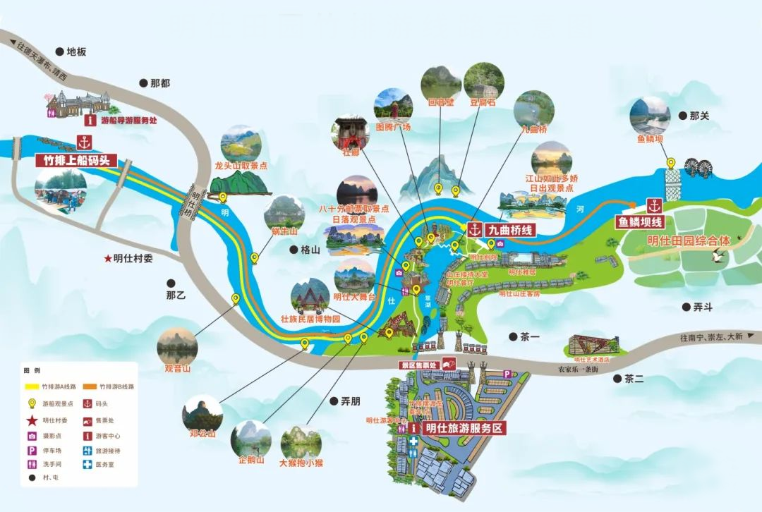 后续游览指引:您在九曲桥码头下船后,向右步行即可前往壮族民居博物园游览。