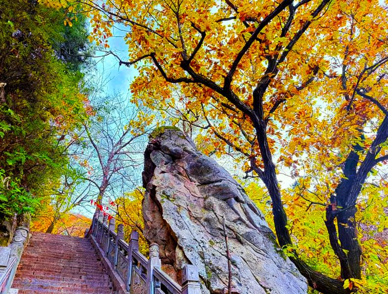 秋:山色绚烂峰峦连绵起伏,色彩层层叠叠,堪称视觉盛宴,枫叶似火,槭树渐黄松柏仍翠,蓝天澄澈。